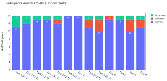 Table 5 presents the instructions for the user study. The data collection was separated into five steps, to which all participants contributed. In the first step, we described the interactive prototype to the teachers by showing its main components and visualizations and how to use it. In the second step, participants were given a URL through which they could later engage with the interactive prototype. In the third step, the participants used the interactive prototype to perform a set of nine tasks. Participants were given a paper sheet with task descriptions and were asked to write their responses to the nine tasks on the paper within 20 min. In the fourth step, the participants were asked to enter their answers into Mentimeter—which is an interactive presentation platform with an easy-to-use online editor—while all could watch the results appearing, together with the researchers. Finally, in the fifth step, the researchers asked the teachers a number of reflection questions and had a short discussion about the dashboard. The participants shared their comments, attitudes, or feelings about it.