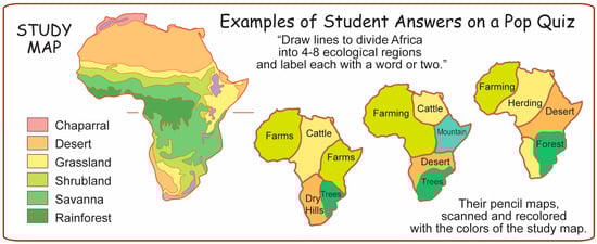 If this sounds like an argument against teaching map skills with already-completed maps of “kid-friendly” topics like UFO sightings or soft-drink names, so be it. A better alternative is for students to make their own regional maps of topics that are important in other subjects they are studying in the same part of the school year. Then, they can make frequent use of these mental maps to help them interpret maps of other topics. This is the logic behind the creation of online “clickable” maps that allow users to select topics for display (e.g., http://textbooks.wmisd.org/GeographicBigIdeas.html accessed on 16 November 2023).