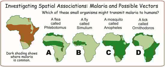 The example of malaria shows why spatial associations are important in geographic inquiry. Comparing maps to see whether specific things often occur together is a very useful way to identify possible causes (and to rule out implausible ones, as in Figure 2). The notion of association can also help people remember the general positions of geographic regions. For example, a teacher could have briefly mentioned malaria and then projected a map of its occurrence to help students remember the general position of humid rainforests and floodplains in Africa [].