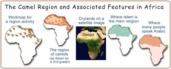 Better still, we should not wait until high school to teach about environments in Africa. Teachers could read aloud about camels in first grade. (Kids like these ungainly animals, especially after viewing videos that show how camels chew sideways, slobber a lot, and sound like Chewbacca). Then, teachers will pass out a simple map like the leftmost one in Figure 3 and have students draw a line around “the area where camels like to live”. Teachers should have kids color that area, call it the camel region, and then describe its shape and position in words. If children do this in first grade, they will start to build a mental map of Africa. This map, in turn, can help them interpret and remember other maps in future classes: deserts in earth science, Arabic language in human geography, Islam in world history, and desertification in current events. In short, the students have not only learned how to learn from maps, but they have also added a useful mental map that can help to interpret other maps in the future.