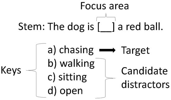 Nevertheless, these methods alone do not necessarily produce adequate distractors since there are specific requirements distractors should satisfy [,]: (1) Be an incorrect answer to the question; (2) Be related to the correct answer, semantically or from the same category (i.e., nature, color, exercise); (3) Be grammatically correct and consistent with the difficulty of the correct answer, and; (4) Be of the same word class and a similar length to the target word.