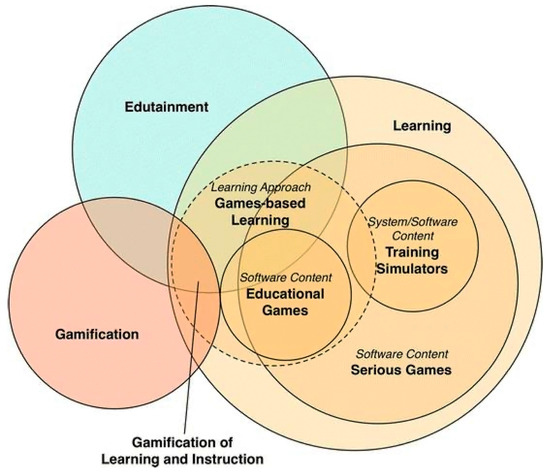 Game-based learning (GBL) has garnered widespread recognition as an effective educational and training tool [1]. A survey conducted by the “Games and Learning Publishing Council” shed light on the integration of digital games into teaching, revealing that 55% of the nearly 700 educators surveyed have incorporated games into their curriculum on a weekly basis [2]. Over the past decade, the realms of academia and edutainment have witnessed a surge in interest surrounding serious games, GBL, e-learning, and gamification [3]. These concepts have considerable overlap and often share elements with one another. In practice, differentiating between games and “artefacts with game elements” can be a challenging endeavour, as illustrated in Figure 1, which highlights the intricate relationships among these educational approaches. It is worth noting that these concepts often overlap, blurring the lines between traditional games and artefacts with game elements. GBL is an active educational approach that integrates elements and principles commonly found in games, such as gamification, learning objectives, and pedagogical methods, into the learning process. According to Prensky [4], Digital GBL has the potential to enhance and facilitate learning by adding an element of excitement and boosting student motivation and engagement.