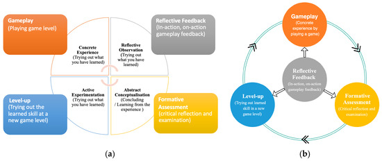 (a) Experiential Learning Cycle (inner circle, Kolb’s learning cycle [35]) and assignment of game-design elements to each stage of the Experiential Learning Cycle; (b) RGD Framework [34], the arrow pointing away from the reflective feedback signifies the integration of reflective learning at every stage of the framework.