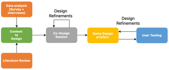 The content of the co-design session was extracted from the primary research [12], i.e., user surveys, focus-group discussion and interview data, and secondary research, i.e., the literature review. Co-design sessions were held iteratively to allow the game to be tested and refined by user testing. A visual representation of the process is shown in Figure 6.
