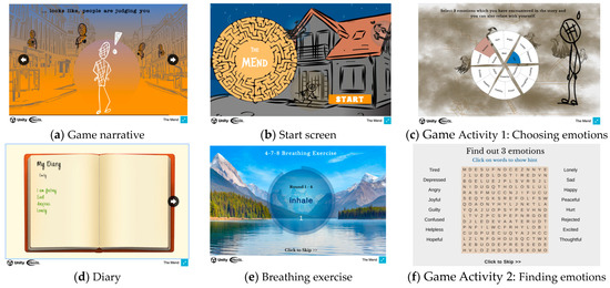 Illustrations of a functional prototype: (a) illustration showing one screen of the game narrative; (b) start screen of the game; (c) illustrating one of the game activity called “Choosing emotions” from wheel of emotions; (d) illustration of a reflective element called the “Diary”; (e) Illustration of a mindful activity called the “Breathing Activity”; and (f) illustration of another game activity called “Find out emotions”.