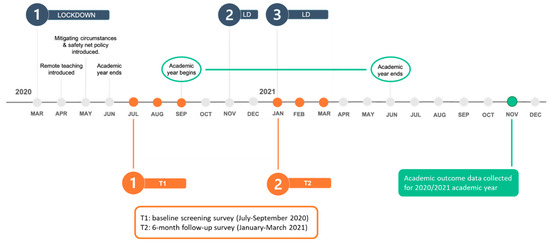 The relationship between mental health symptoms and academic outcomes was then examined using the baseline screening survey data of the RECOVERS study. The baseline screening survey was open for participation between July and September 2020, which was just after the first UK lockdown and the final university term of the academic year. During this period, restrictions were easing, and the UK was returning to some level of ‘normality’. The academic data were collected in November 2021 for the 2020/2021 academic year. Over this academic year, universities were greatly impacted by lockdowns, ongoing changes in restrictions and how courses were delivered. Figure 1 provides further details on the study design and data collection time points.