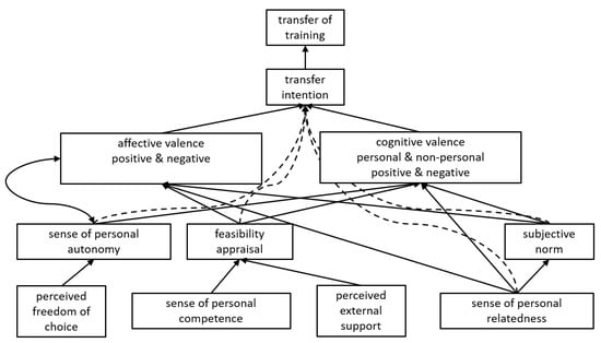 Personal and contextual antecedents of task-specific motivation (e.g., transfer motivation) and behavior (e.g., transfer of training) that the UMTM identifies can be linked to factors that have been found to influence transfer of training [,,,,,,,]. For example, personal feelings of autonomy translate to sense of personal autonomy in the UMTM, whereas social norms and supervisor support are similar to subjective norm and perceived external support of the UMTM. Moreover, these components align with components in existing transfer of training models, e.g., [,,]. Below, we will introduce and discuss the different UMTM components and how they relate to each other.