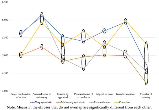 As a next step, we added the UMTM antecedents, outcome variables and demographic characteristics to the model. Figure 3 depicts mean differences between the profiles in the antecedents and outcome variables. In terms of mean patterns, it can be found that the moderately optimistic trainees are a parallel of the mean pattern of the very optimistic trainees. The mean pattern of the personal value and conscious trainees is also largely in line with the mean patterns of the moderately and very optimistic trainees. However, the personal value and conscious profiles mirror each other in relatedness and subjective norm. That is, the personal value trainees score relatively low on sense of personal relatedness and relatively high on subjective norm in comparison to the other components for this profile, whereas the opposite is the case for the conscious trainees.