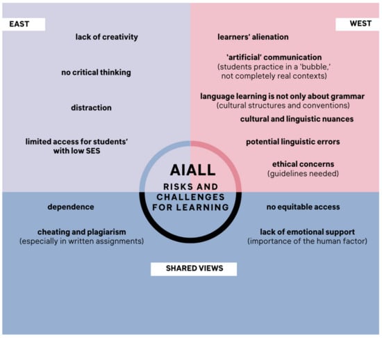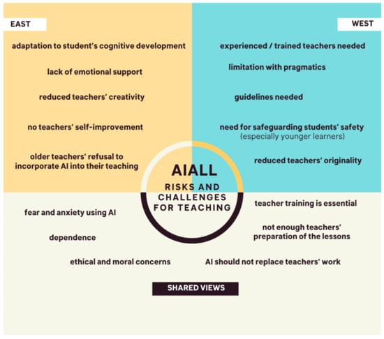 Figure 4 below summarizes the similarities and differences between the voices from the East and the West regarding the risks and challenges of AIALL for teaching.