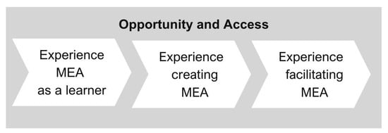 The theoretical framework used for this study was situated learning theory. In situated learning theory, learning occurs best in a community of practice. This theory promotes the idea that true learning occurs when one experiences it authentically in contexts similar to those in which it will be applied [53]. Situated learning effectively explores affective dispositions and beliefs, as well as perceptions in specific learning situations [54]. Central to situated learning theory is the idea that interactions between the learner and the environment are mediated by social interactions [55,56]. By grounding the learning environment in the Equity-Oriented STEM Literacy Framework, we created a community of practice in which PSTs experienced and planned integrated STEM lessons using MEAs. Thus, in a community of practice, PSTs engaged in the high-quality learning activities of engaging in the authentic contexts of being a student, planning instruction, and teaching with a focus on equity and MEAs. The Equity-Oriented STEM Literacy Framework can be applied to PSTs engaging with integrated STEM in this setting (see Figure 3).