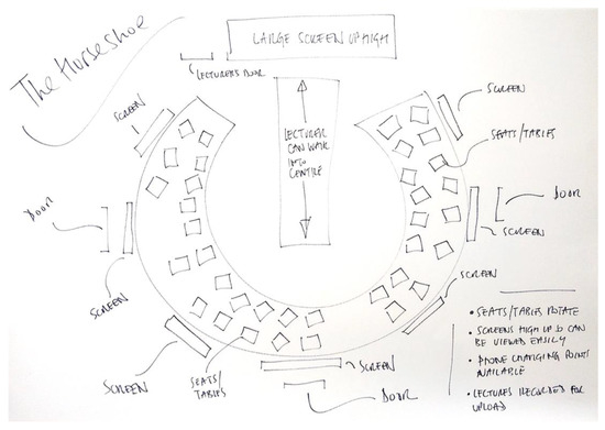 Three of the teacher groups suggested that if the rationale behind having such a large space was to save on real estate, then they would prefer to teach remotely using video conferencing. On the other hand, students were more open to compromise on the size of the room, as they were motivated by the potential for increased interaction and engagement. They proposed to reduce the size of the room (up to 200 seats) and to instead focus on creating dynamic and flexible layouts. Figure 3 depicts an example of such a proposal, the ‘Horseshoe’, which was suggested by the students of Sandpit 3.