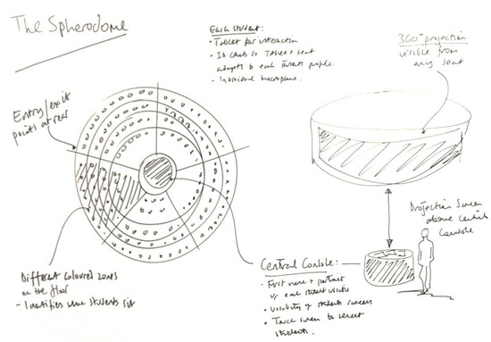 Additionally, there were suggestions from various groups of teachers and students about the shape of the room. Rather than being in a square format, it should be rounded or circular since it would give a sense of “openness and be more inspirational” and a sense of “depth.” The ‘Spheredome’ (Figure 4) is an example of redesigns of the ‘Cube’ that focuses on changing the shape of the room to a circular layout.