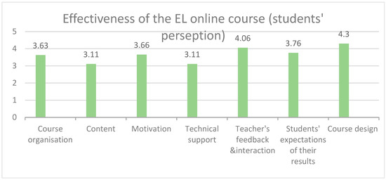 Human motivation has a very complex nature [16], thus making it difficult to pinpoint the reasons for assigning a low value to this factor. On the one hand, there are studies with evidence of increased learners’ motivation [17]; on the other hand, there are those which clearly argue that the online environment decreases motivation and learners’ involvement [18]. Apparently, the point to consider is that the motivation factor needs further analysis, and more attention should be given to this aspect when fully implementing the EFL course in the future.
