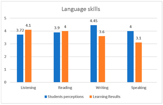 Having adopted the factor system proposed by Mashaw, we grouped the questions from the questionnaire into categories, highlighting the important constituent factors of the developed EL online course. We first calculated the average rating for each of the items (Table 1), and then we obtained an average rating for the categories (Figure 1). Separately, we compared students’ perceptions of learning outcomes in four language skills: listening, reading, writing, and speaking, as well as evidence from the summative assessment tests administered at the end of the course (Figure 2).