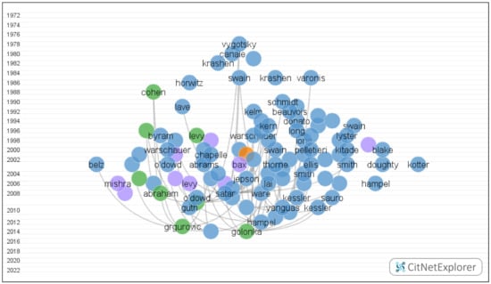 The authors utilized VOSviewer to calculate the top ten authors, sources, organizations, and countries. As Table 2 shows, the top ten co-cited authors include Smith, B.; Peterson, M.; Chapelle, C.A.; Lee, L.; Ziegler, N.; Baralt, M.; Warschauer, M.; Dooly, M.; Guichon, N.; and Satar, H.M. The top ten co-cited sources in Table 3 include Studies in Computer Assisted Language Learning, Language Learning & Technology, ReCALL, Modern Language Journal, Educational Technology & Society, System, Foreign Language Annals, Interactive Learning Environments, Computer & Education, and Language Teaching Research. The top ten co-cited organizations are illustrated in Table 4, including the University of Maryland, Iowa State University, the Open University, Arizona State University, the University of California (Davis), Griffith University, the University of California (Irvine), the University of Hong Kong, Michigan State University, and Kyoto University. When calculating the top ten co-cited countries, the authors ignored documents that were co-authored by numerous countries. Thus, the verified selected ten countries or areas in Table 5 are the USA, Taiwan, the People’s Republic of China, Japan, Australia, the UK, Spain, New Zealand, Türkiye, and the Republic of Korea. According to the first three tables, the majority of the co-cited authors, indexed journals, and organizations are American and British.