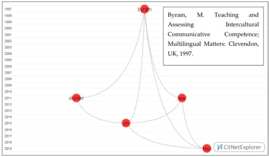 By selecting [20] and [19] in CitNetExplorer, there were six publications and 10 citation links among them. After drilling down the longest path, the authors identified the citation relationship of five publications [19,20,38,39,40] in Figure 4. Intercultural competence was first set forth as one of the components of the model of ICC [20]. The following publications emphasized the learning outcome of language learning using web-based pedagogies [19] or social media [39] in terms of intercultural competence, thus showcasing that the development of intercultural competence was a hot issue in synchronous online interaction courses, especially in EFL and ESL learning.