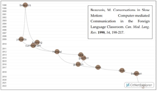 The authors then found the second-longest path of 12 publications, with the initial one [42] published in 1998 and the last one [43] issued in 2022. The visualization of the second longest path was then illustrated in Figure 5. From the citation network, it is evident that social presence is a hot issue regarding SCMC. According to Beauvois [42], networked computers were regarded as an innovative tool used in research and education. Their usage in synchronous communication was a combined process, exerting a positive impact on foreign language learning with multifaceted outcomes. Later, the function and perception of web cameras and interlocutors’ presence in online multimodal interaction were deeply discussed [17,44,45].