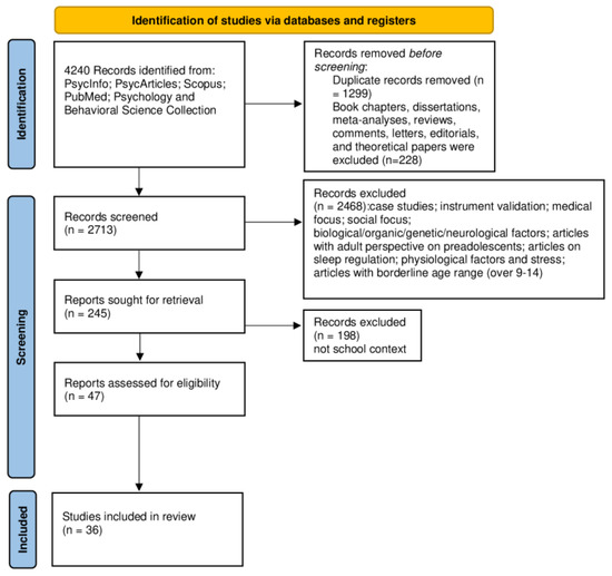 A total of 4240 abstracts were located of which 1527 were removed, being duplicates or not articles. A total of 2713 studies were screened against titles and abstracts. Subsequently, 2468 studies were excluded, principally because they did not fit the inclusion criteria and 47 studies were about school settings. A total of 36 studies finally met our inclusion criteria and, concerning the school context, were included (see Figure 2).