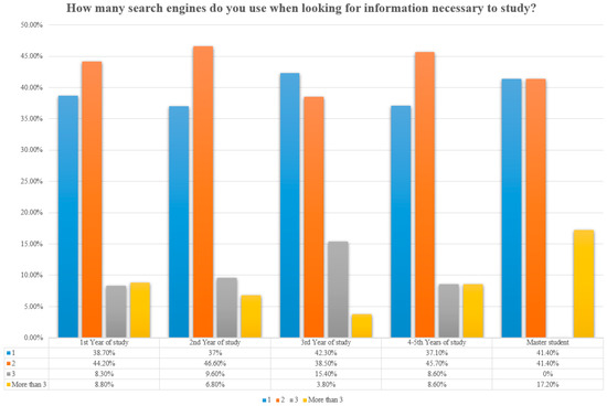 The diagram (Figure 2) shows the distribution of respondents’ answers to the question, “How many search engines do you use when searching for information necessary for the study?”. As can be seen from the presented diagram, this indicator practically does not depend on the course of study. At the same time, 38.07% of respondents use one search engine, 44.6%—two, 8.24%—three, and 9.09%—use more than three search engines.