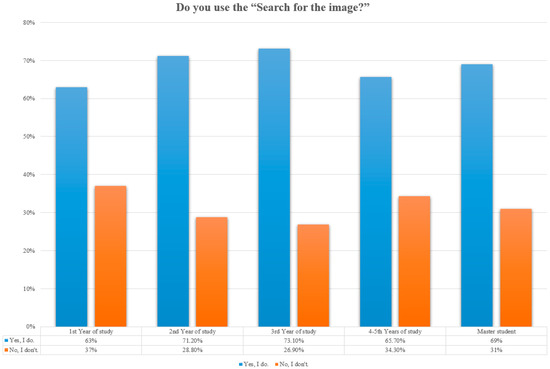 In addition, from a chart visualizing respondents’ answers to the question “Do you use the Image Search tool?” (Figure 3) it can be concluded that the use of this tool does not practically depend on the course of study. Among all respondents, the number of those who actively use the tool “search by image” reaches 65.9%.
