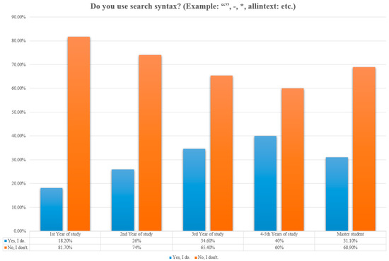 So, the diagram (Figure 4) shows the distribution of respondents’ answers to the question “Do you use search syntax? (Example: “ “, -, *, allintext: etc.”, according to which one can clearly observe an increase in the number of affirmative answers from one to five courses in undergraduate and specialist programs. So, in the first year, the number of answers “Yes, use” reaches only 18.20%, while in the 4th–5th year, it is already 40%. At the same time, there is a decrease to 31.10% in the group of masters.