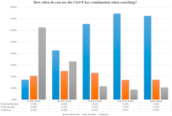 The distribution of respondents’ answers to the last question in this block is shown in the diagram (Figure 5). So, analyzing the statistics of answers to the question “How often do you use the key combination “Ctrl + F” when searching?” trends similar to the previous diagram can be noted. So, in the first year, the percentage of students who constantly use the “Ctrl + F” key combination when searching for information reaches only 17.2%, while in all subsequent courses, this percentage grows and reaches 74.3% in 4–5 years of study. At the same time, for the group of masters, there is again a slight decrease to 72.4%.