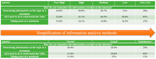 Figure 9 shows the distribution of respondents’ answers to the question “How do you remember the information you find on the Internet?” depending on the motivation for learning and current academic performance. With the help of the orange arrow in the diagram, there is a very noticeable tendency to simplify the methods of information analysis as academic performance and motivation decrease. So, with “Very high” motivation, each of the presented options accounts for about a little more than 30% (34.8%; 32.6%, 32.6%), while as the level of motivation decreases, more labor-intensive ways of analyzing information, such as its structuring or note-taking become less popular among those surveyed. As a result, for students with a level of motivation for learning “Very low,” the option with the simplest method of analyzing information is 65%, while its structuring and note-taking account for only 20% and 15%, respectively.