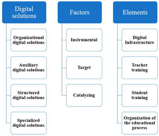 Thus, the authors identified three main aspects (Figure 10): factors, elements, and digital solutions.