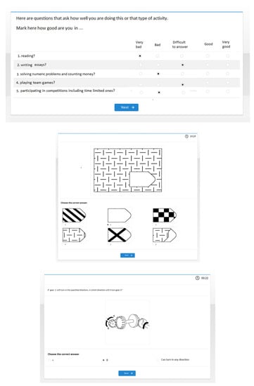The initial data for the experiments were the results of mass testing of schoolchildren and students using a digital platform for psychological research [6]. Students were asked to complete a battery of tests including questions, cognitive tests, and tasks. Figure 1 shows examples of web pages with user tasks. The platform used a web interface that users opened on any of their devices with Internet access. Not only the results of the answers were saved, but also the reaction times of the users. The latter were used in the present study. The student could see their answer time in the upper left corner of the screen.