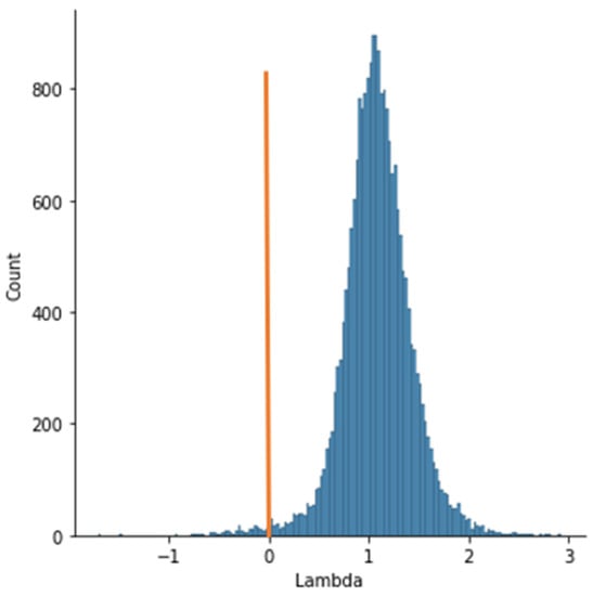 With the reduction of the initial sample (users’ data containing values beyond 3σ were removed) to 13,444 records, the LLE calculations were performed. Figure 5 shows the distribution of λ values for the modified sample.