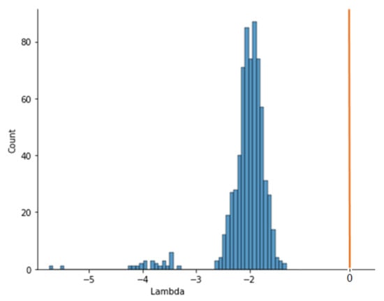 It was found that out of 22,236 entries, 21,663 entries had a non-negative λ. Figure 4 shows the distribution of λ values for the entire sample. The orange line is the border, to the right of which there are positive values, that is, chaos takes place. There are 573 records with negative λ.