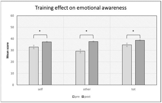 Historagrams representing mean scorings at the LEAS-C for self, other, and total subscales as assessed during pre- (white) and post-training (grey) assessments. The data show significant improvements in the three measures after the training.
