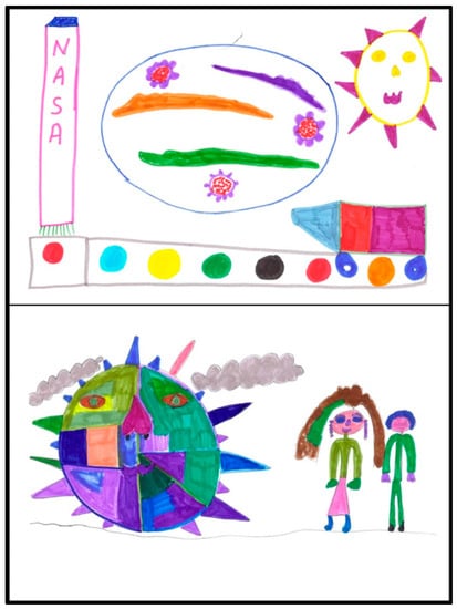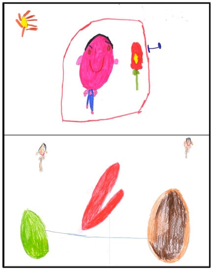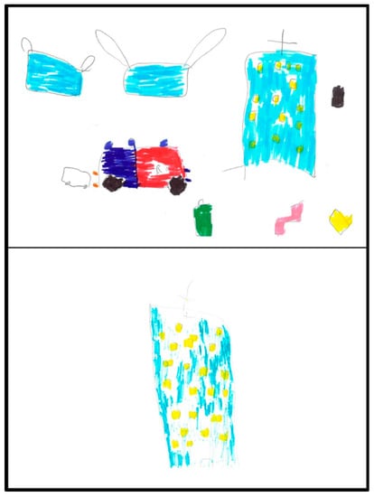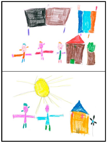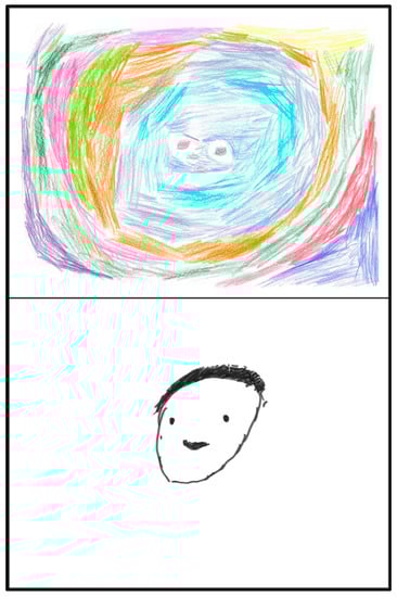 The qualitative analysis was conducted following a phenomenological approach. The applied operational model is the “Polysemeiotic Model” (Modello Polisegnico, []). For each drawing, a report was produced considering the graphic elements in the paper (see also [,]). In detail: line (tract, pressure, pattern); materials (tempera, pencils, chalks, watercolors, collage, mixed technique); shape (open/closed, round/edged); space (high/low, left/right, empty/full, perspective, direction, crowding, balance, articulation); color (warm/cold, light/dark, contrasts, black/white, saturated/unsaturated). A certified art therapist not aware of the aims of the research and not involved in it evaluated the drawings.