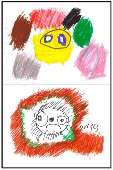 A previous qualitative study used semi-structured individual interviews to investigate the impact of COVID-19 on people with ID [] and highlighted three main themes that are compatible with our analyses. The first is the lack of physical contact and the proximity of the loved ones. The presence of this theme is suggested in our study by the use of closed or semi-closed circular shapes, which have been interpreted as the need for protection and isolation. The second is the forced changes to everyday routines due to the lockdown. In the present research, this topic was conveyed by the presence of looming elements and the sensation of being blocked by a health emergency. Third and finally, the presence of difficulties in understanding the preventive measures which are, in our case, represented by an approximate description and definition of the coronavirus, which was interpreted as a lack of awareness of the situation.