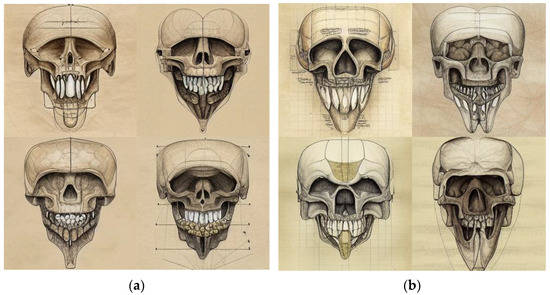 The prompt was entered on 12 December 2022: “/Imagine Educational schematic drawing of skull anatomy with teeth”: (a) Variations of unsuccessful attempt of AI-generated image of skull end teeth; (b) Other failed attempt to AI-create schematic of skull and teeth.
