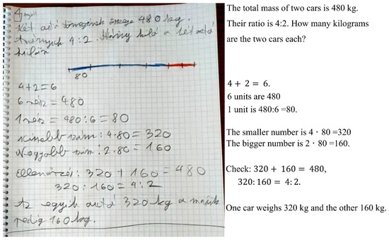 Two answers to this assignment demonstrate the use of the code table. The problem proposed by Student 50 from School 1 is presented (Figure 1): The total mass of two cars is 480 kg. Their ratio is 4:2. How many kilograms are each of the two cars?