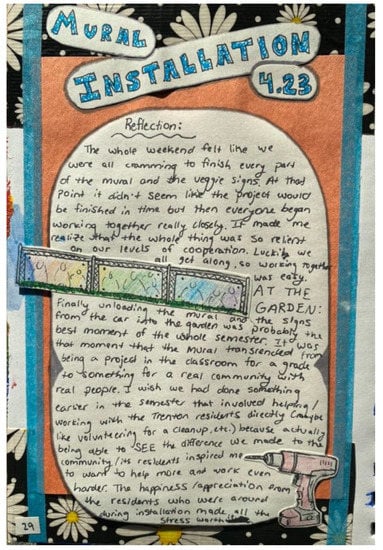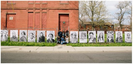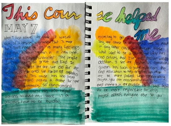Returning to the research questions, data reveal that the outcomes of CBAE among participants in higher education include a range of entangled social, emotional, and academic outcomes. Community-based art education, in which “stakeholders learn from one another…while developing art skills, building meaningful connections through artistic collaboration, and inspiring personal and communal transformation in themselves and others” [44] (p. 10), provides a framework to embed content in fully authentic ways. Similar to prior studies of community organizations that found participation engendered community leadership and civic dialogue [1,2], all students reported feeling more connected to the people of Trenton, indicating a deepening understanding of their own personal histories and preconceptions. Through interacting with residents, students developed increased empathy toward members of the Trenton community and the individuals they encountered, thereby broadening their sense of community. Students also discovered a sense of connectedness with their classmates, evincing what Wenger calls a “community of practice” [41] which developed through sustained collaborative work toward a common goal and resulted in a greater personal investment in the outcomes of the project. The many hours students spent synchronized in symbolic production may have been a contributing factor [26].