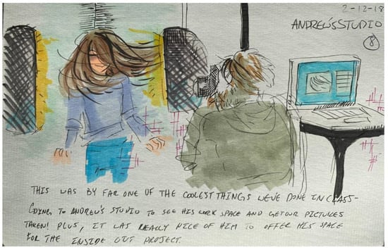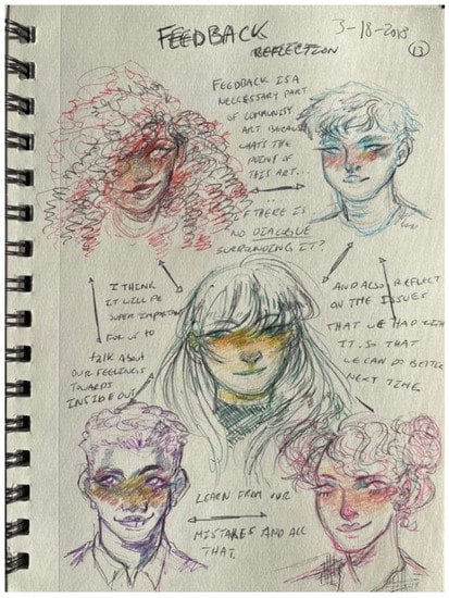 Dahlberg, Drew, and Nyström suggest a combination of fieldwork, interviews, observations, drawings, and narratives as methods for collecting meaningful data [52]. The research study utilized participant observation, including informal interviews with students while working on course projects, the projects themselves, surveys, focus groups, and visual journals as sources of data. Input was also provided by the four collaborating artists.