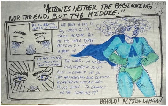 Participating in collaborative coproduction demands the development of relationships and necessitates communication where trust is essential to moving forward with a partner and a project. Garber [58] and Kester [59] both articulate the discursive nature of collective artmaking that relates to identified social needs and was evident in student work (see Figure 8). As one student wrote, “What’s the point to this art if there is no dialogue surrounding it?” (Figure 9). Discourse is not just linguistic, but an openness to ideological exchange:
