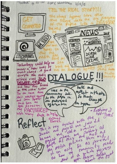 Student participants were asked to complete assignments aligned with the expectations of an advanced visual arts course, including participation in two community-based projects and regular contributions to visual journals. The projects themselves utilized the C.R.A.F.T. (contact, research, action, feedback, and teaching) methodology articulated by Knight and Schwarzman, et al. [53] to ensure a responsive and collaborative stance toward the community. Early projects involved researching a local community organization, followed by an assignment to generate grant proposals for the Old Trenton neighborhood in response to their call for proposals. Research into the history and current sociopolitical trends in the city weighed heavily in the first half of the semester. The course involved frequent trips into the city and interaction with Trentonians, including our cooperating artists and many local arts organizations, thereby facilitating local, personal interactions.