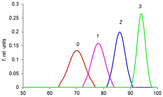 To illustrate remark 2, an optimistic scenario and a pessimistic scenario of an educational process development are shown in Figure 3, with the estimation f of a sample relative distribution function/frequency Qk. The latter is a k-stage assessment, which could be measured on a 100-score scale. The evaluations of all stages characterize the quality of achieving goals against a unified scale along with the sequential tests tk, k = 0…k0 connected with the discrete values of V(tk) parameter. k = 0 corresponds to the initial (diagnostic) stage of testing students at the beginning of the course. k = k0 is the final knowledge and competence testing procedure. There’s k0 = 3 in the example. Diagnostic testing is aimed at dividing students into groups with relatively similar levels of knowledge.