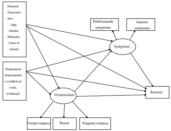 The analyzed model included eight variables. Teachers’ personal characteristics included ethnicity, age, gender, and years at school. Teachers’ professional characteristics included workload and conflict at work; victimization via verbal abuse, property damage, and threats of violence; and somatic and posttraumatic symptoms. The model indicated an association between teachers’ background variables and professional characteristics and victimization. Associations were also present between burnout, victimization, and symptoms. All eight variables were associated with burnout.
