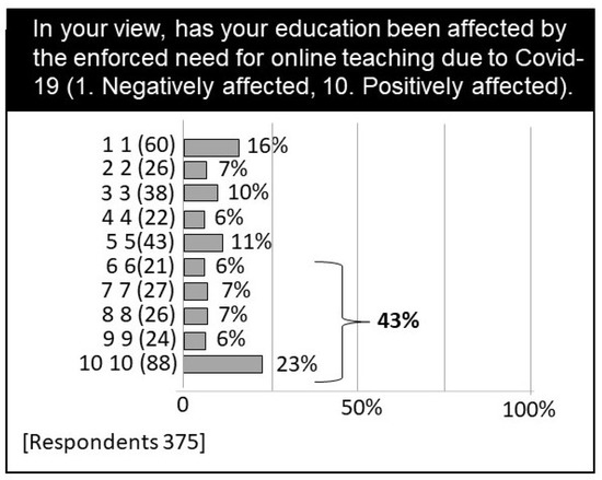 Bar chart of student perception of COVID-19 effects on education, 43% indicate that their education has been positively affected due to the pandemic.