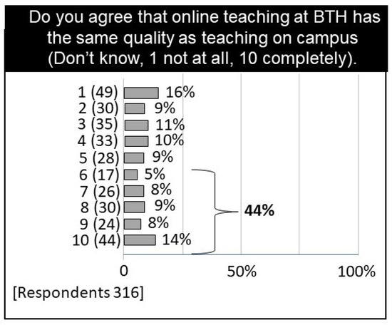 Bar chart visualizing student perception of online and campus teaching quality, 44% of the respondents agree that online teaching has the same quality as campus teaching.