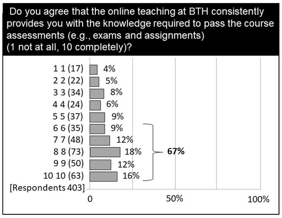 A large majority of the students agree that online teaching consistently provided them with the knowledge required to pass the course assessments (e.g., exams and assignments), result shown in Figure 4. The question use 10 point Likert scale and was number 12 in the order.