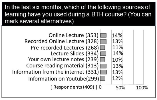 In the survey the students indicated different types of material for learning they used in a course in the last six months. A complete list of sources is listed in Figure 5. The questions was formed as a multiple choice questions and we observe that the use of learning sources are evenly distributed between different materials; online lectures, lectures notes, course reading material etc. Learning materials from Youtube or similar platforms are very often videos that the students themselves identifies as relevant and relevant to their learning process.