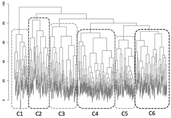 Result of cluster analysis, visualized in an Hierarchical Dendrogram. CX—Cluster X, ranging from cluster 1 to 6.