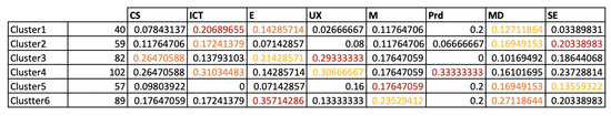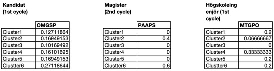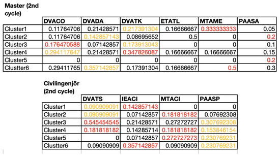Figure 8 presents a more detailed view of the cluster where the distribution of students from the different programs are clustered and presented. The color coding shows the top three programs in each cluster as red for the most represented, orange for the second most represented and yellow for the third most represented. As can be seen, there is no discernibly pattern that shows which clusters are mostly associated with a single program. For instance, Cluster 1 has a high representation of ICT students, but also E and MD students. Looking instead across clusters we, for instance, see that ICT is also highly represented in Clusters 1, 2 and 4, with almost an equal distribution among each cluster. Similar observations can be made for most programs.