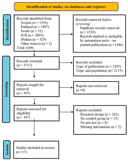 The systematic review was conducted following the recommendations of the previously established Reporting Elements for Systematic Reviews and Meta-Analyses (PRISMA) guidelines [52]. Between July and September 2022, some relevant articles on the above topic were reviewed. Systematic reviews have as their primary objective the grouping of scientific evidence available in the literature through establishing inclusion criteria that will answer the research questions. The following search string was used in the Scopus, Pubmed, Scielo, JCR, and Dialnet databases in both English and Spanish: (“game-based learning” OR “GBL” OR “serious games” OR “educational games” OR “instructional games” OR “games for learning” OR “edutainment” OR “board games” OR gamif*) AND (“Physical education” OR exercise OR fitness OR health OR “sport learning” OR sport*).