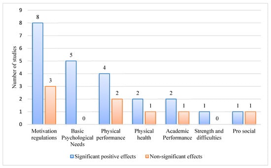 Motivation regulation has a preponderance of significant effects on intrinsic motivation based on the included studies. This is followed by introjected regulation, identified regulation, and integrated regulation. Finally, although there is one case, no such significant effects were found for extrinsic motivation. As shown in Figure 2, among the basic psychological needs, autonomy, competence, and relatedness obtained significant results in the five studies. The physical performance and physical health variables did not follow a logical pattern regarding significant results. In some physical endurance tests and muscular strength tests, the authors reported positive results. Contrary to this, other authors failed to demonstrate that student physical or mental health improved.